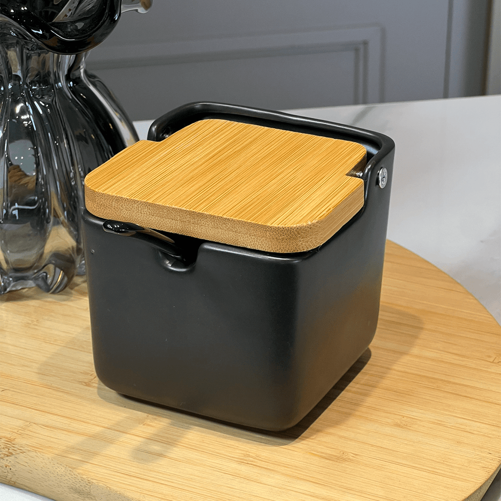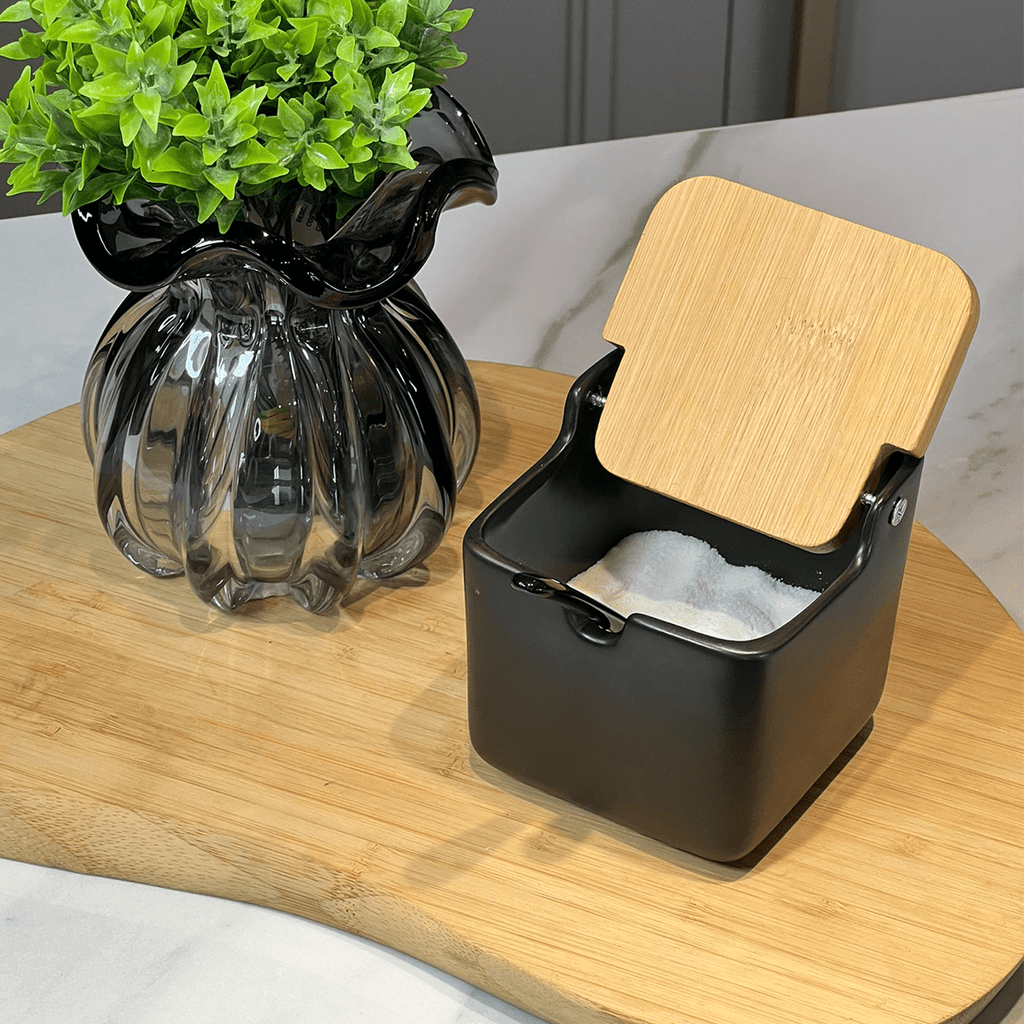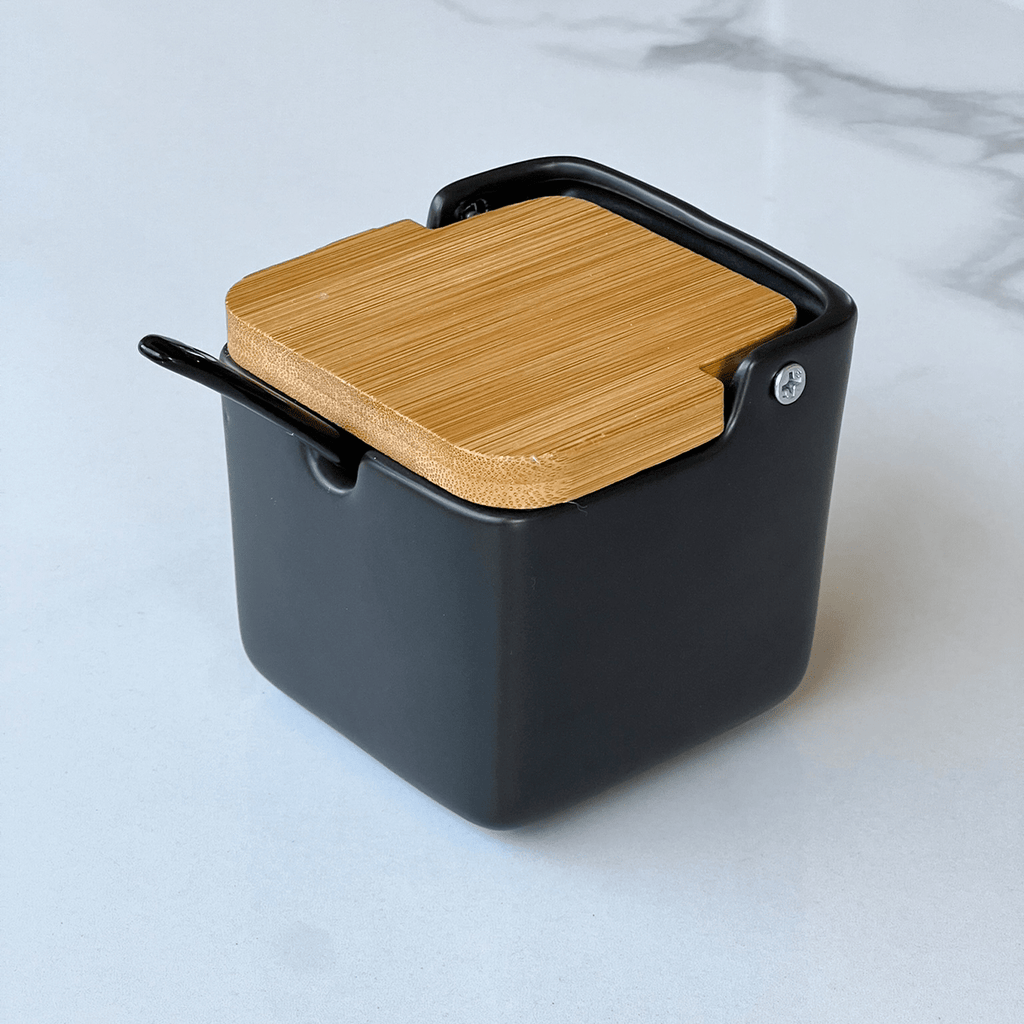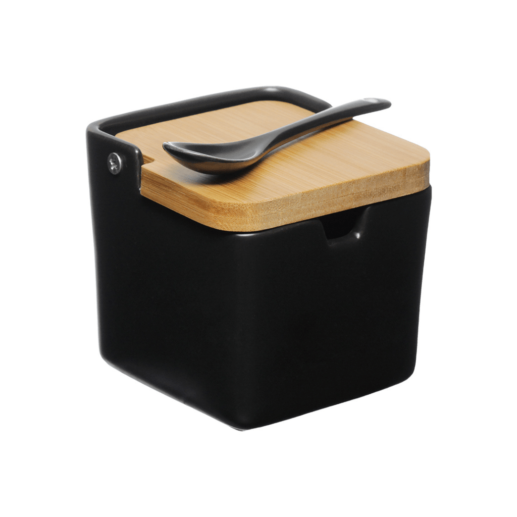 - O pote para sal possui uma tampa feita de bambu, material ecologicamente correto e super resistente contra bactérias e esporos;